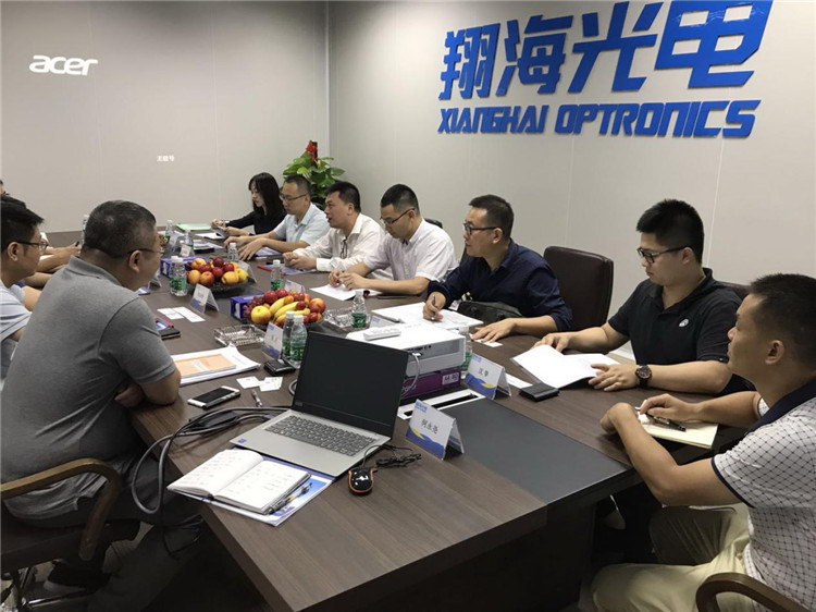 2018年11月22日上午佛山市南海区投资促进局副局长高瑞灵、陈剑勋等考察成员在佛山市南海区里水镇招商局周可局长的陪同下对翔海光电公司进行考察。 公司领导曹展豪、钱庆等亲自接待并进行亲切座谈,在座谈会上钱总对公司的发展进行详细的解说,并解答考察团成员提出的所有问题;会议中曹总和钱总就公司发展阶段对政府部门所提供的支持提出实际期望想法。
