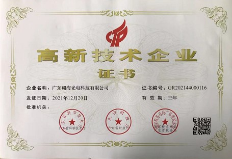 近日,集团子公司广东翔海光电科技有限公司(下称“光电公司”)顺利通过前期一系列的国家高新技术企业认定审查工作,获得了由广东省科技厅、财政厅和国税总局广东省分局联合颁发的《高新技术企业证书》。
